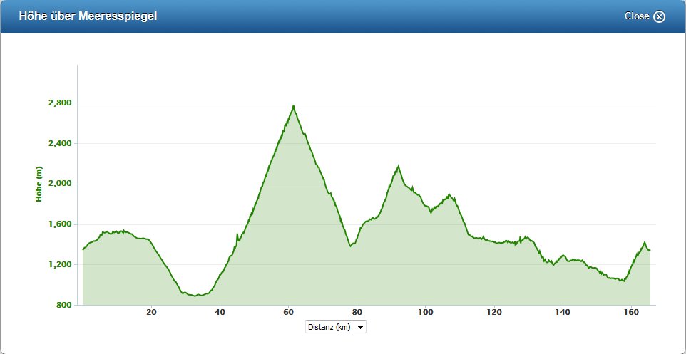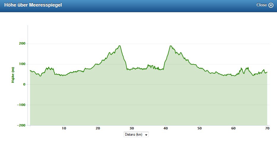 Da sind es nur 1000 Höhenmeter, die aber im Grunde aus dem welligen Streckenprofil resultieren, denn echte Anstiege gibt es da nicht.